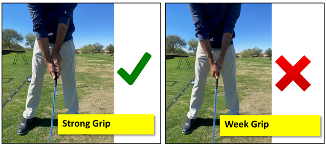 A slice most definitely means the club face is open, so no matter what else you do, if you don’t change that, you will struggle. Some people try to rotate their forearms or twist their wrists, but let’s make sure your grip isn’t what’s opening the face. The term is “strengthening” your grip, this doesn’t mean tighter, or more power, it just means rotating your lead palm (left hand for right-handed golfer) toward your body.