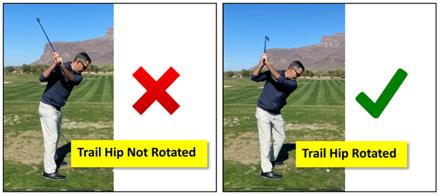 Next, if you’re trying but unable to turn the trail hip, double check that you don’t have too much knee bend in your address position. It is common, especially for athletic golfers, to load the legs for power by bending their knees too much. This can actually limit mobility in your lower half making it hard to rotate the trail hip. You don’t want straight legs but try standing a little taller to help rotate that trail hip!